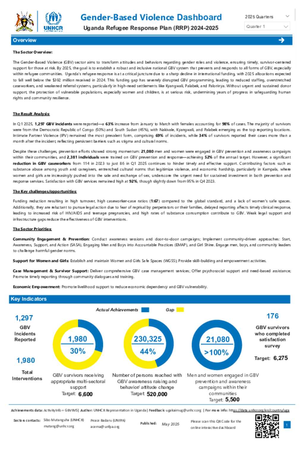Uganda Refugee Response: GBV dashboard Quarter 1 2025. Dashboard with key sector figures for the response, achievements against key indicators and operational presence for the sector.
