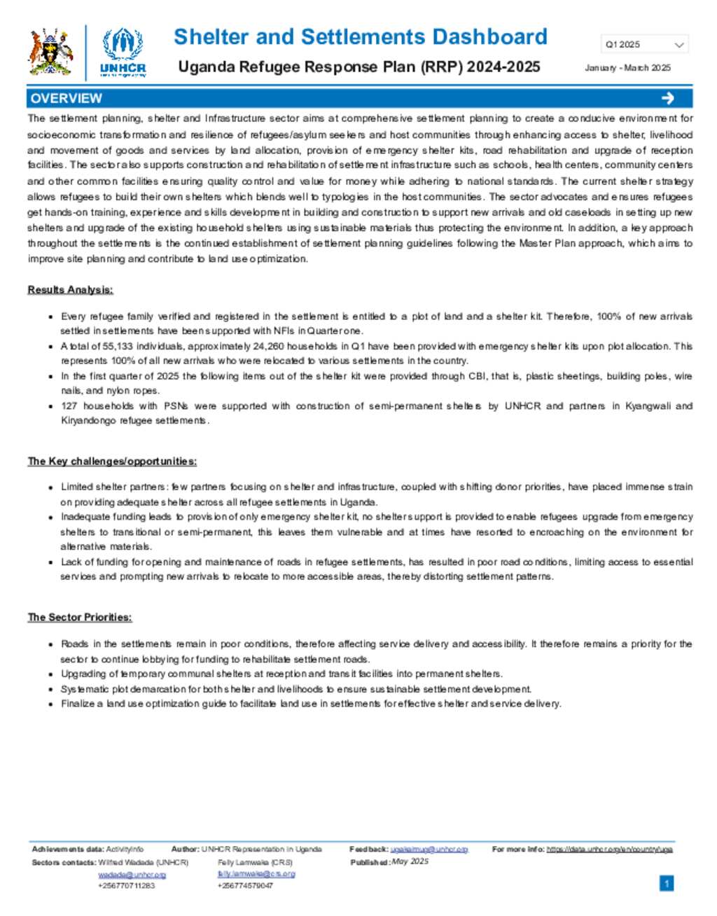 Uganda Refugee Response: Shelter, Settlement and NFI dashboard Quarter 1 2025