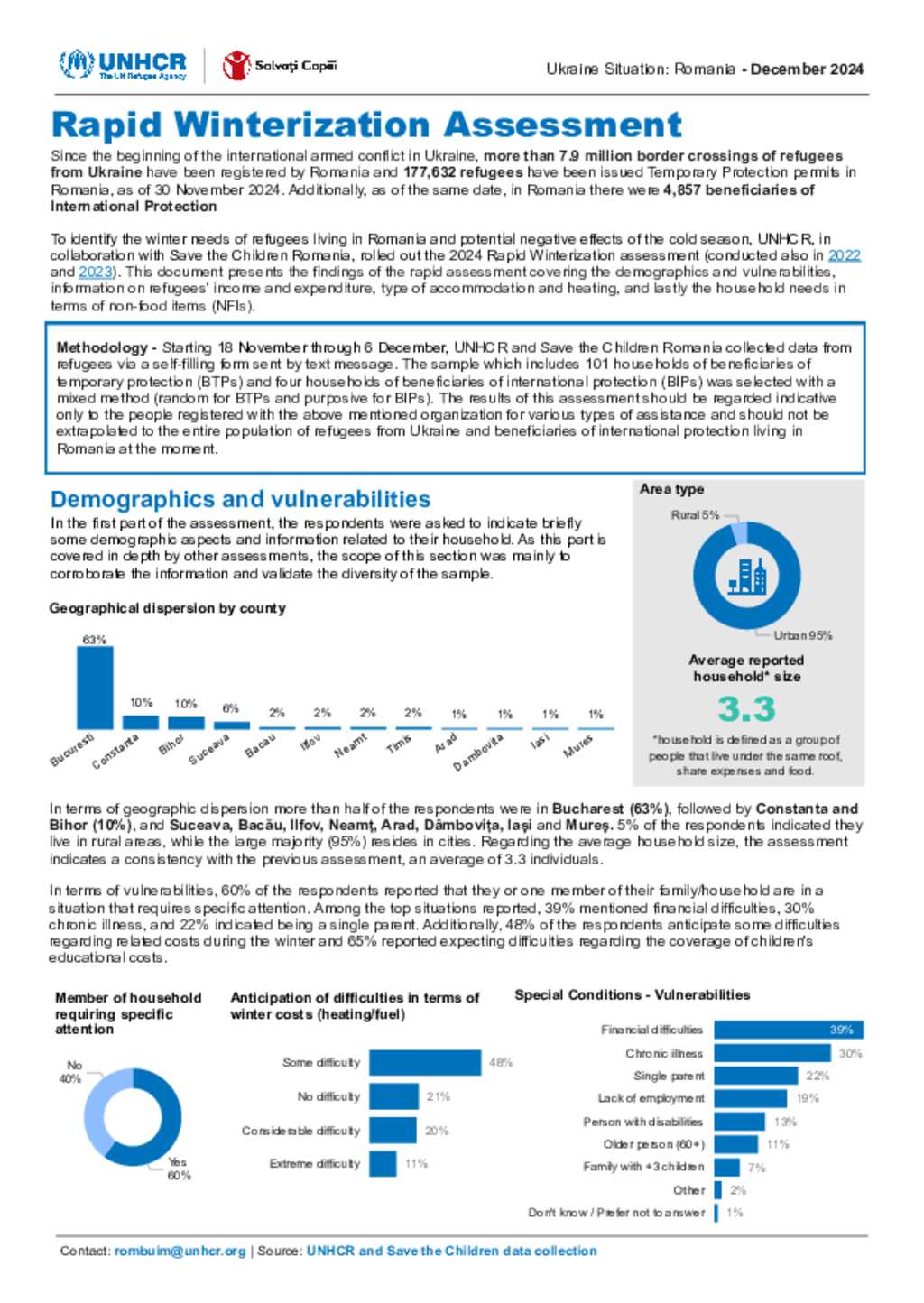 To identify the winter needs of refugees living in Romania and potential negative effects of the cold season, UNHCR, in collaboration with Save the Children Romania, rolled out the 2024 Rapid Winterization assessment. This document presents the findings of the rapid assessment covering the demographics and vulnerabilities, information on refugees' income and expenditure, type of accommodation and heating, and lastly the household needs in terms of non-food items (NFIs).