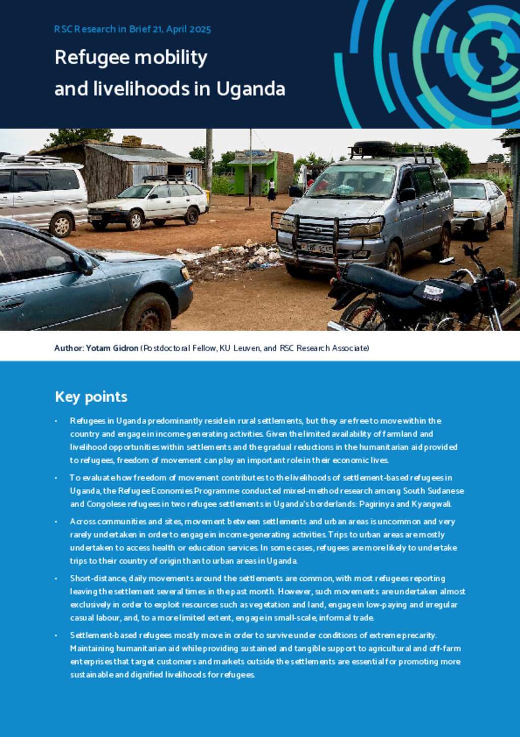 Refugees in Uganda predominantly reside in rural settlements, but they are free to move within the country and engage in income-generating activities. Given the limited availability of farmland and livelihood opportunities within settlements and the gradual reductions in the humanitarian aid provided to refugees, freedom of movement can play an important role in their economic lives. To evaluate how freedom of movement contributes to the livelihoods of settlement-based refugees in Uganda, the Refugee Economies Programme conducted mixed-method research among South Sudanese and Congolese refugees in two refugee settlements in Uganda’s borderlands: Pagirinya and Kyangwali. Across communities and sites, movement between settlements and urban areas is uncommon and very rarely undertaken in order to engage in income-generating activities. Trips to urban areas are mostly undertaken to access health or education services. In some cases, refugees are more likely to undertake trips to their country of origin than to ur