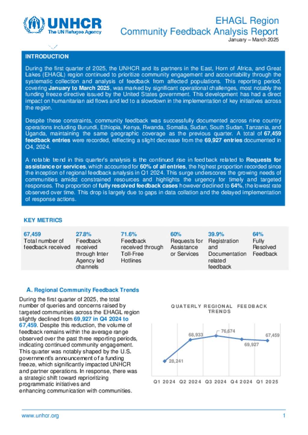 During the first quarter of 2025, the UNHCR and its partners in the East, Horn of Africa, and Great Lakes (EHAGL) region continued to prioritize community engagement and accountability through the systematic collection and analysis of feedback from affected populations. This reporting period, covering January to March 2025, was marked by significant operational challenges, most notably the funding freeze directive issued by the United States government. This development has had a direct impact on humanitarian aid flows and led to a slowdown in the implementation of key initiatives across the region.
