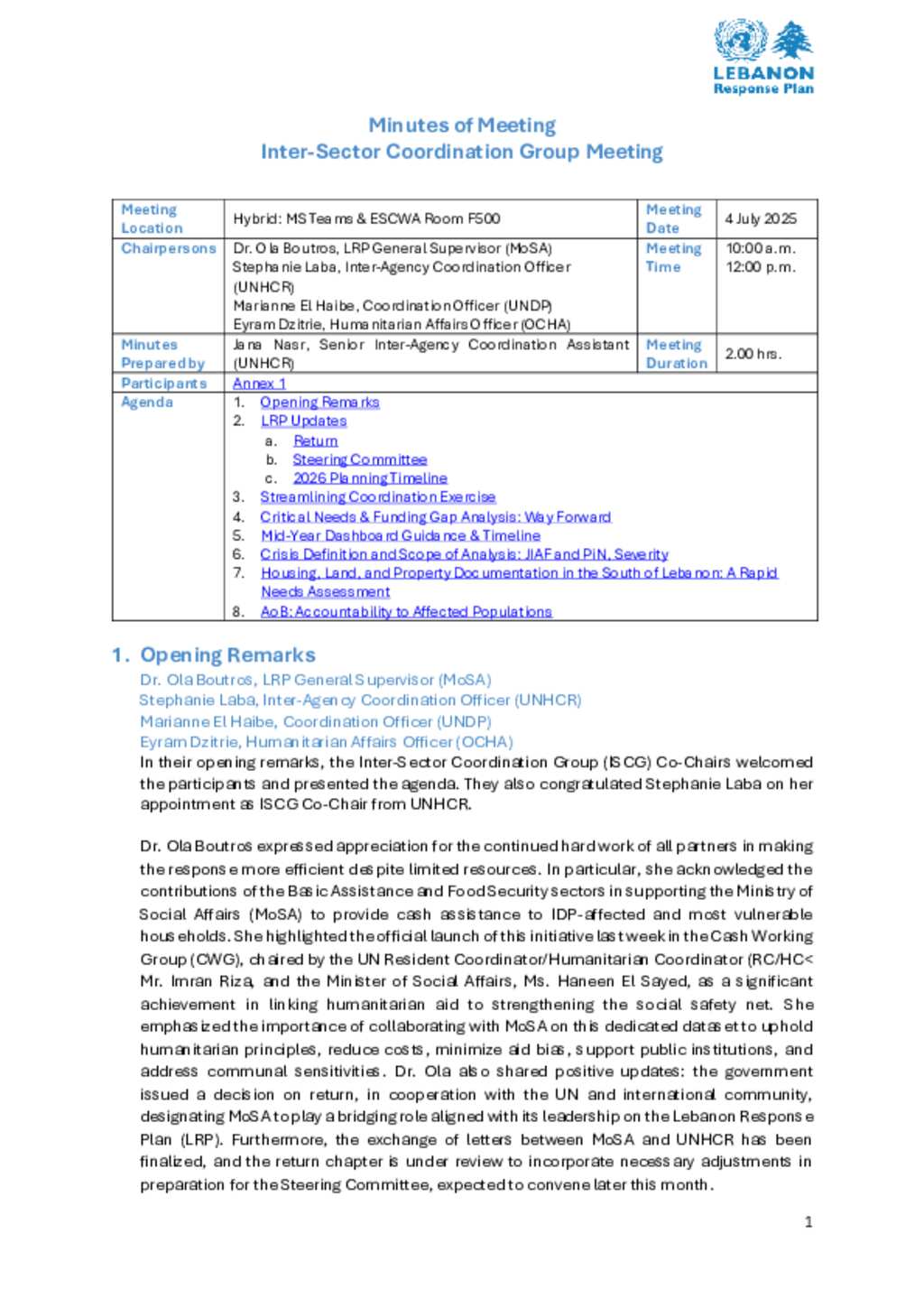 Lebanon: Inter-Sector Coordination Group Minutes of Meeting - 4 July 2025