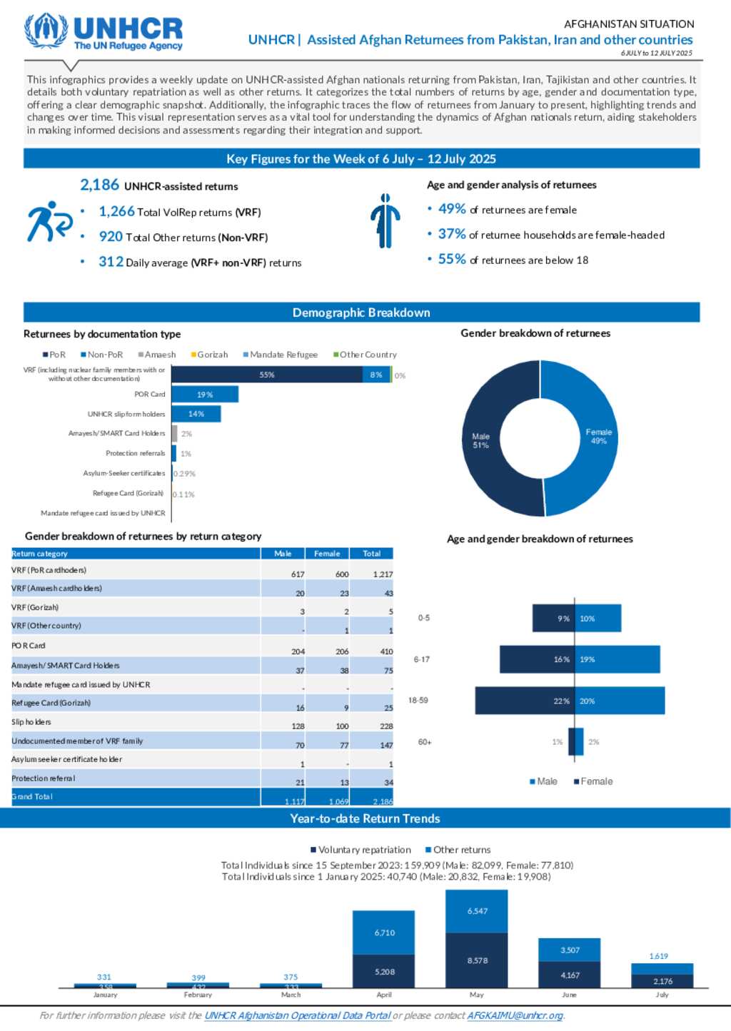 This dashboard provides a weekly update on UNHCR-assisted Afghan nationals returning from Pakistan. It details both voluntary repatriation as well as forced returns. It categorizes the total numbers of returns by age, gender and documentation type, offering a clear demographic snapshot. Additionally, the infographic traces the flow of returnees from January to present, highlighting trends and changes over time. This visual representation serves as a vital tool for understanding the dynamics of Afghan nationals return, aiding stakeholders in making informed decisions and assessments regarding their integration and support.