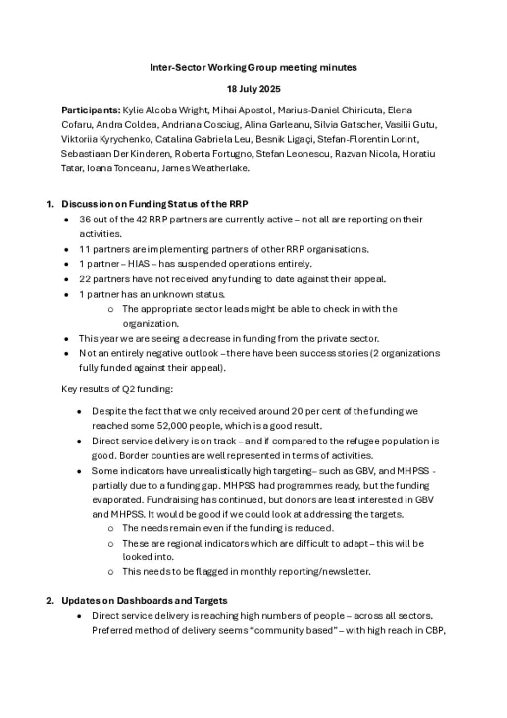 Meeting minutes of the Romania Inter-Sector Working Group.