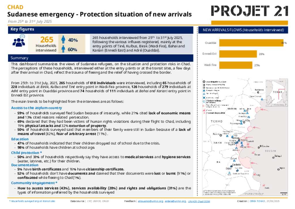 This dashboard summarizes the views of Sudanese refugees, on the situation and protection risks in Chad. The perceptions of these households, interviewed either at the entry points or at the transit sites, a few days after their arrival in Chad, reflect the trauma of fleeing and the relief of having crossed the border. From 27th June to 3rd July 2025, 951 households of 2,721 individuals were interviewed, including 1,205 households of 821 individuals at Birak, Kulbus and Tiné entry point in Wadi-Fira province, 176 households of 558 individuals at Adré entry point in Ouaddai province and 433 households of 958 individuals at Bahai and Kariari entry point in Ennedi Est province.