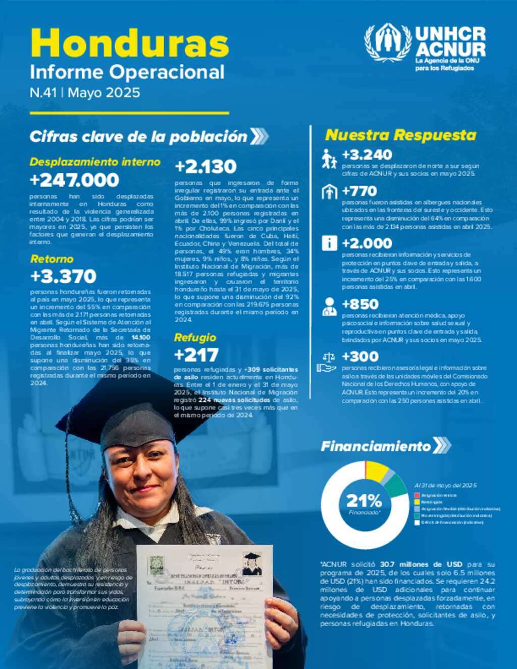 Reporte operacional de la oficina de ACNUR en Honduras que corresponde a mayo de 2025.