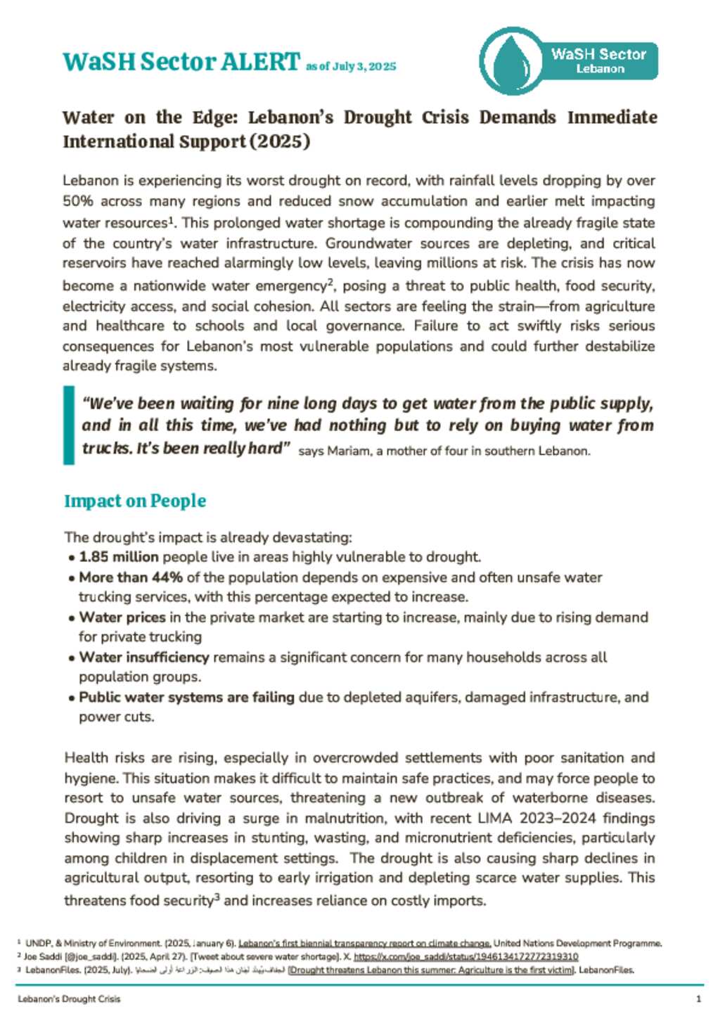 This WaSH Sector Alert (July 3, 2025) serves as an early warning and advocacy tool in response to Lebanon’s most severe drought on record, with rainfall over 50% below average and growing pressure on water infrastructure and services. The alert highlights emerging impacts on public health, agriculture, and access to water, while calling attention to urgent preparedness needs. A national Drought Vulnerability Map - based on a Composite Drought Vulnerability Index (DVI) - identifies 274 cadasters as highly or very highly vulnerable, using indicators such as groundwater quality, aquifer resilience, land use, population pressure, and climatic stress. The document outlines priority actions for emergency response and long-term resilience, and calls for $42.2 million in funding to sustain water access and strengthen Lebanon’s climate-resilient WaSH systems.