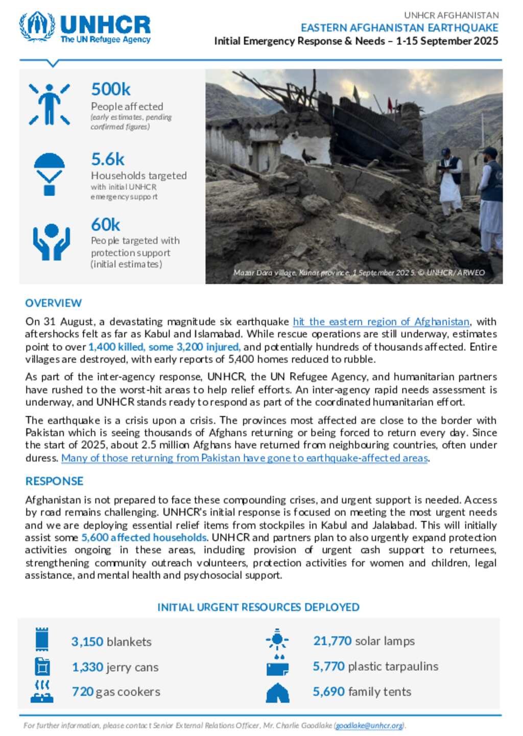 UNHCR Afghanistan Earthquake Response and Needs (1-15 September 2025)