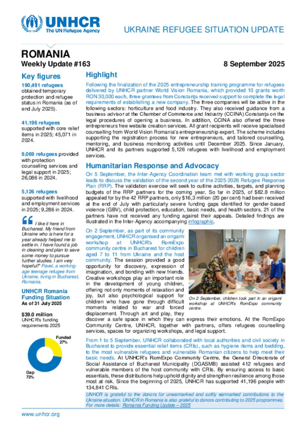 UNHCR Romania Ukraine Refugee Situation Update - 8 September 2025
