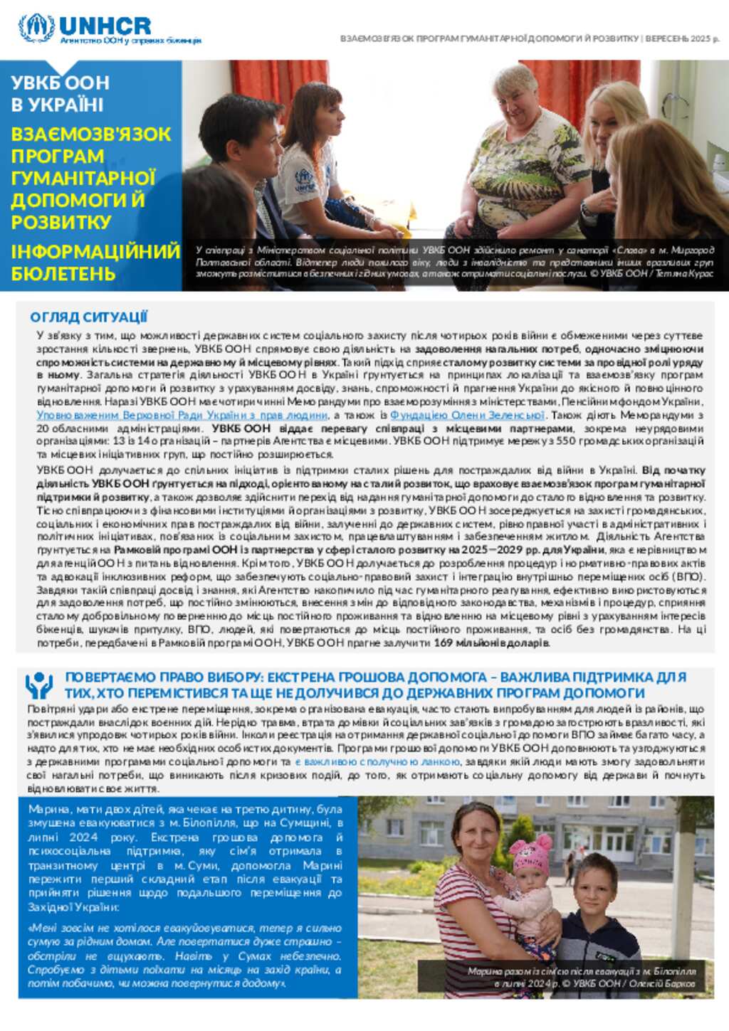 УВКБ ООН в Україні. Взаємозв'язок програм гуманітарної допомоги й розвитку. Інформаційний бюлетень. Вересень 2025р.