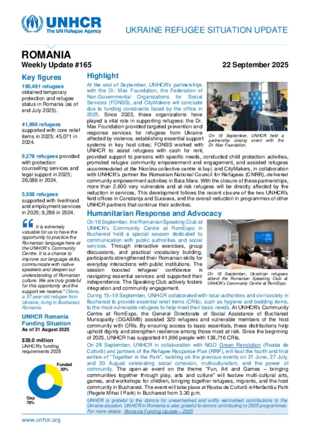 UNHCR Romania Ukraine Refugee Situation Update - 22 September 2025