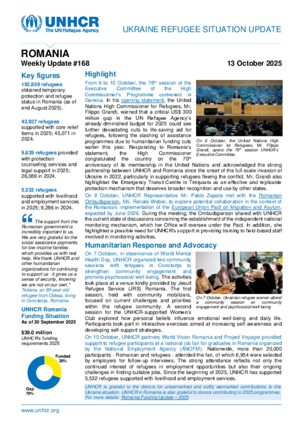 UNHCR Romania Ukraine Refugee Situation Update - 13 October 2025