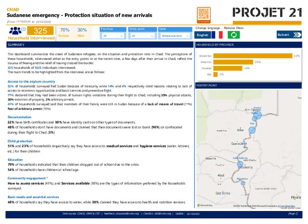 This dashboard summarizes the views of Sudanese refugees, on the situation and protection risks in Chad. The perceptions of households interviewed either at the entry points or at the transit sites, a few days after their arrival in Chad, reflect the trauma of fleeing and the relief of having crossed the border. 325 households of 1025 individuals interviewed.