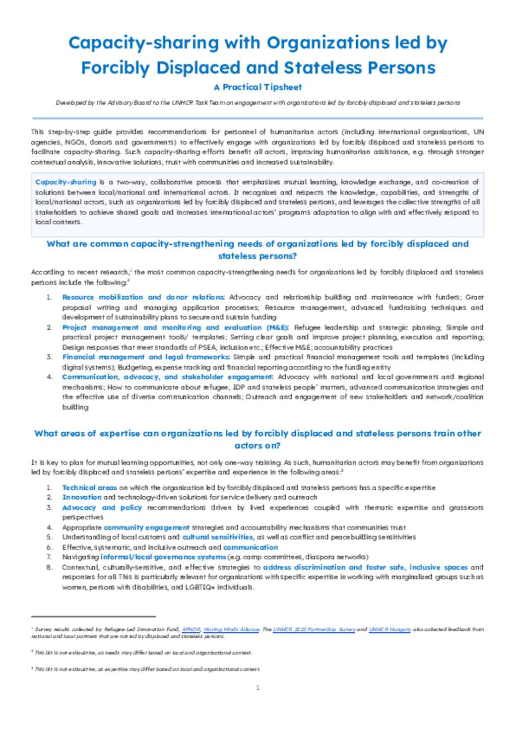 Capacity-sharing with Organizations led by Forcibly Displaced and Stateless Persons: A Practical Tipsheet