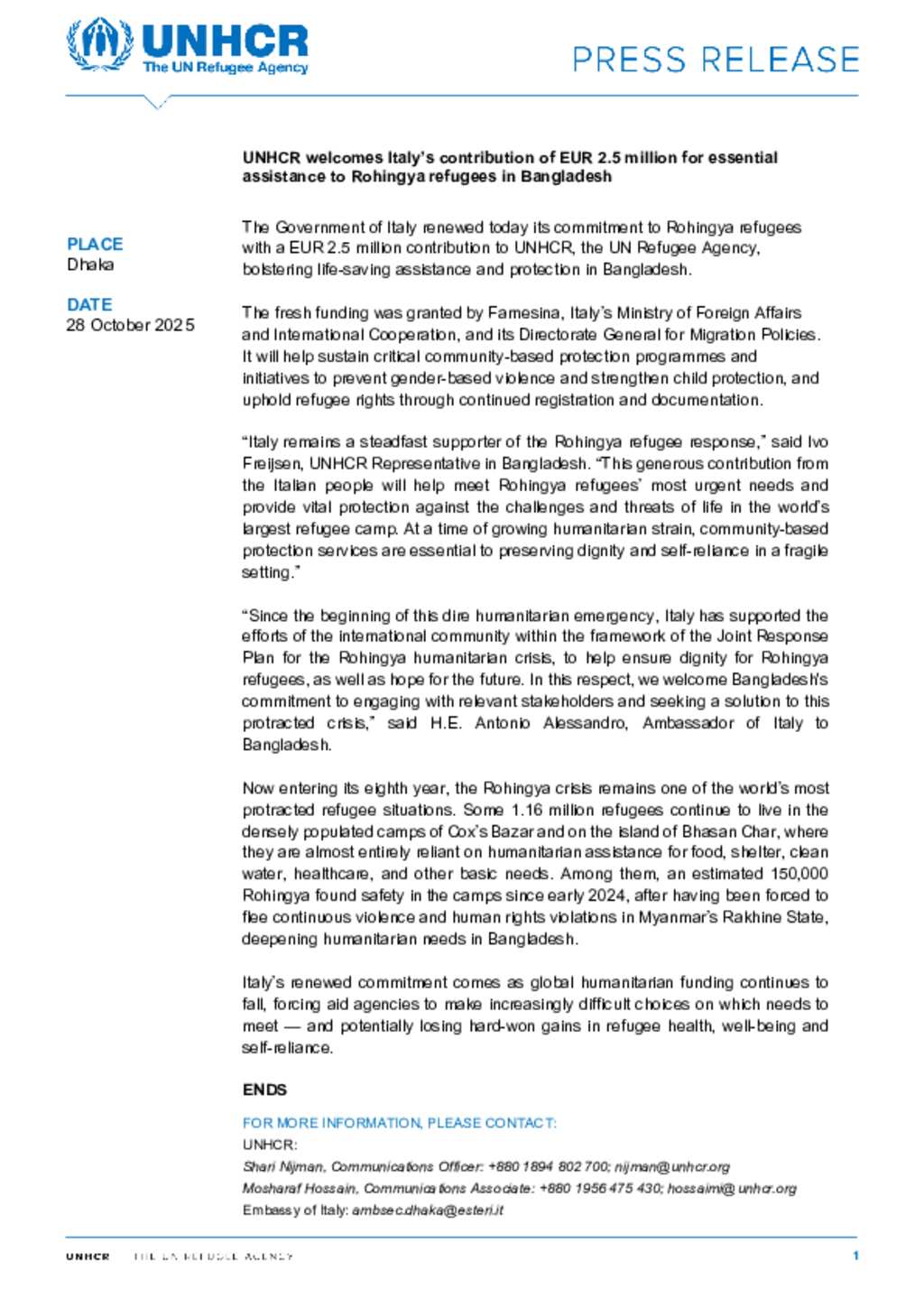 UNHCR welcomes Italy’s contribution of EUR 2.5 million for essential assistance to Rohingya refugees in Bangladesh ENG