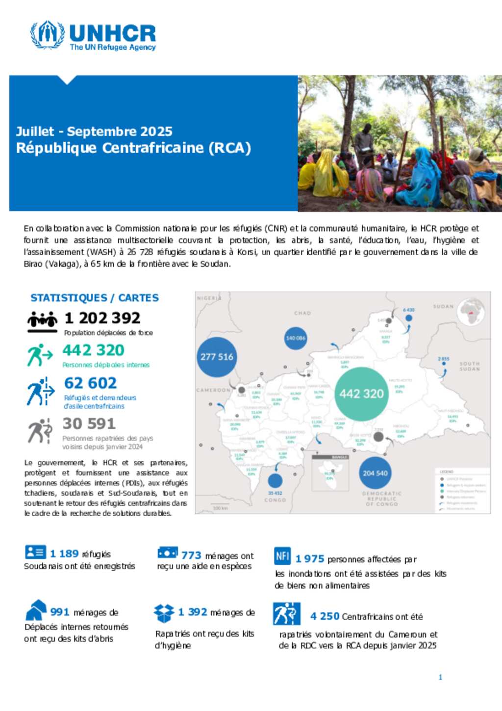 En collaboration avec la Commission nationale pour les réfugiés (CNR) et la communauté humanitaire, le HCR protège et fournit une assistance multisectorielle couvrant la protection, les abris, la santé, l’éducation, l’eau, l’hygiène et l’assainissement (WASH) à 26 728 réfugiés soudanais à Korsi, un quartier identifié par le gouvernement dans la ville de Birao (Vakaga), à 65 km de la frontière avec le Soudan.