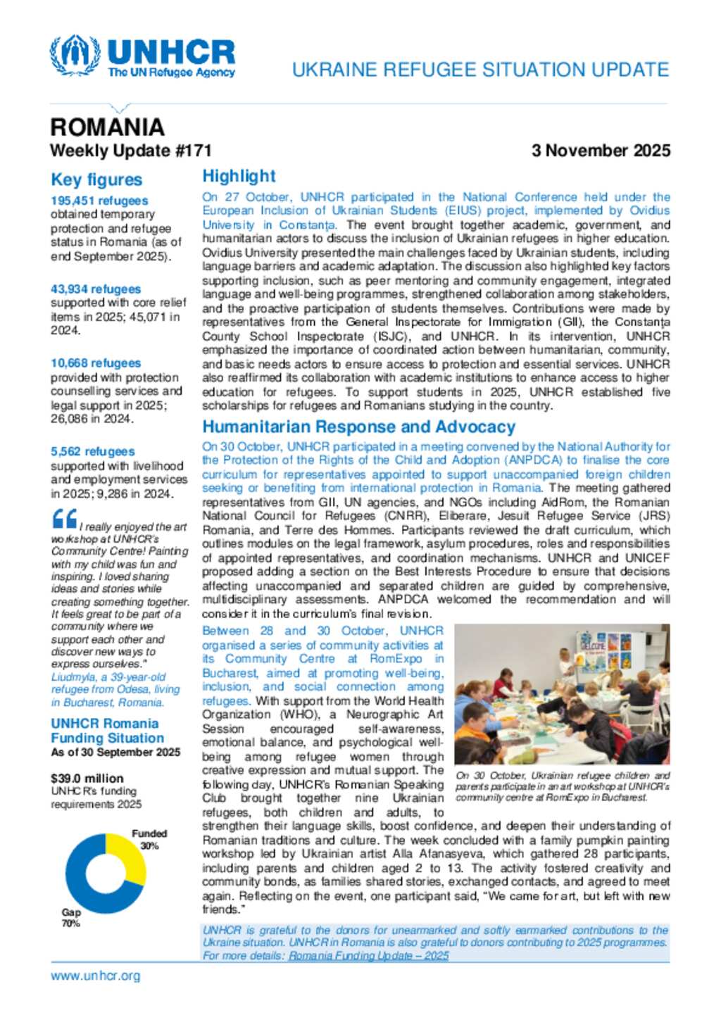 UNHCR Romania Ukraine Refugee Situation Update - 3 November 2025