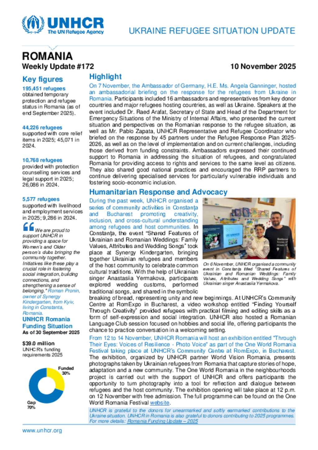 UNHCR Romania Ukraine Refugee Situation Update - 10 November 2025
