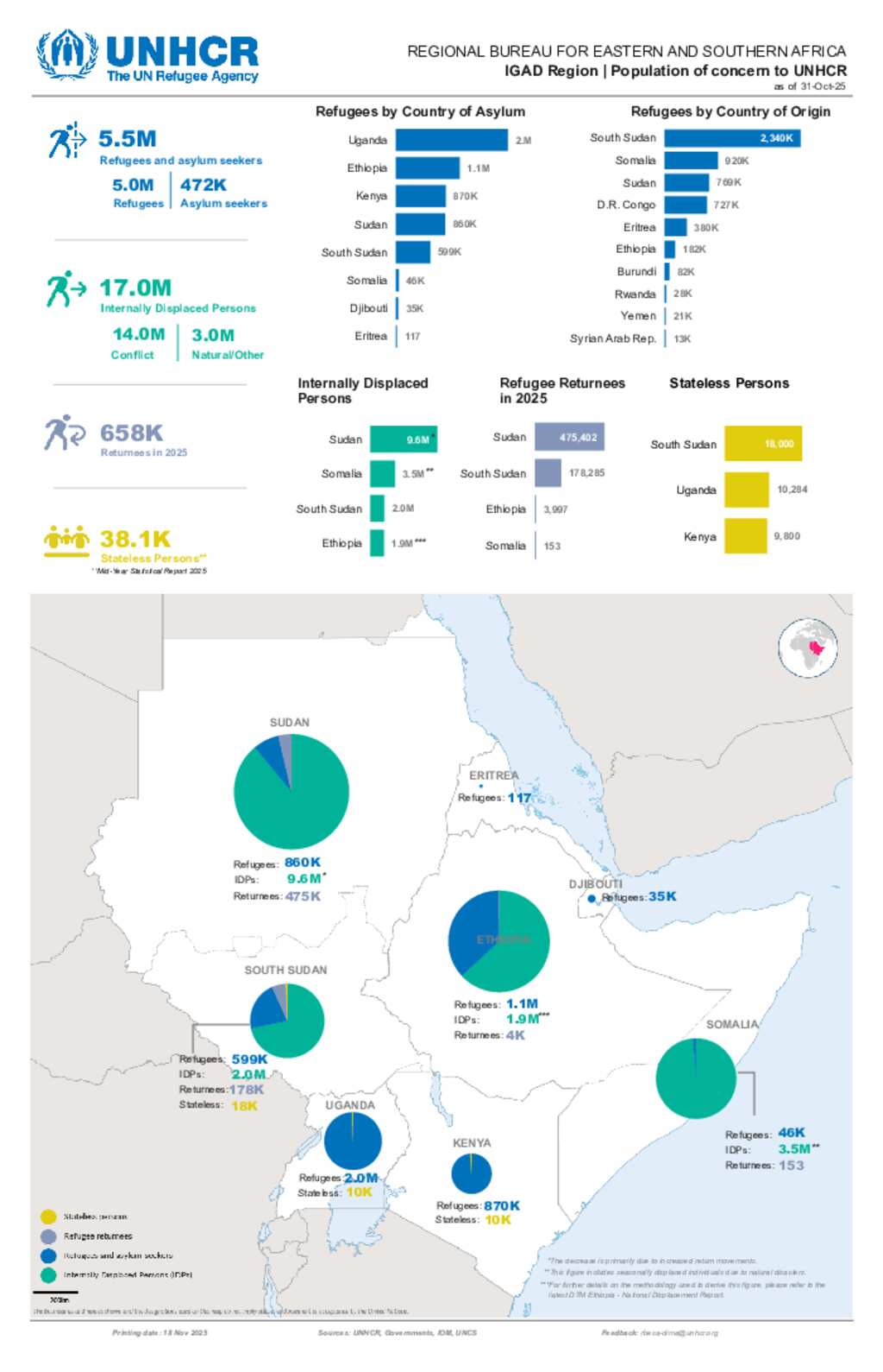 Regional Dashboard RBESA: Refugees, returnees and internally displaced persons in the IGAD region - 31 October 2025