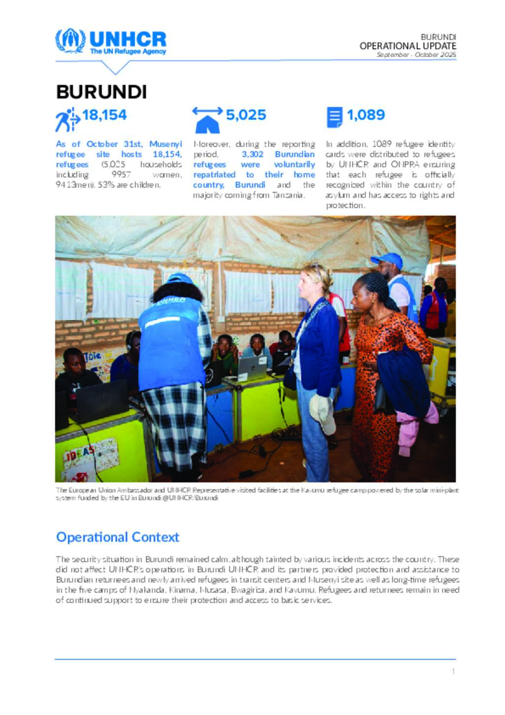 As of October 31st, Musenyi refugee site hosts 18,154, refugees (5,025 households including 9957 women, 9413men). 53% are children. Moreover, during the reporting period, 3,302 Burundian refugees were voluntarily repatriated to their home country, Burundi and the majority coming from Tanzania. In addition, 1089 refugee identity cards were distributed to refugees by UNHCR and ONPRA ensuring that each refugee is officially recognized within the country of asylum and has access to rights and protection.