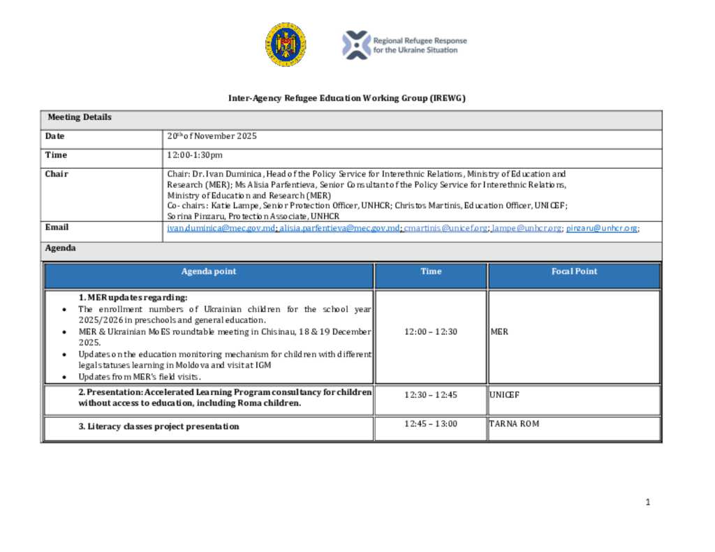 Ukraine Situation - Moldova: Inter-Agency Refugee Education Working Group (REWG) Meeting Minutes (20 November 2025)