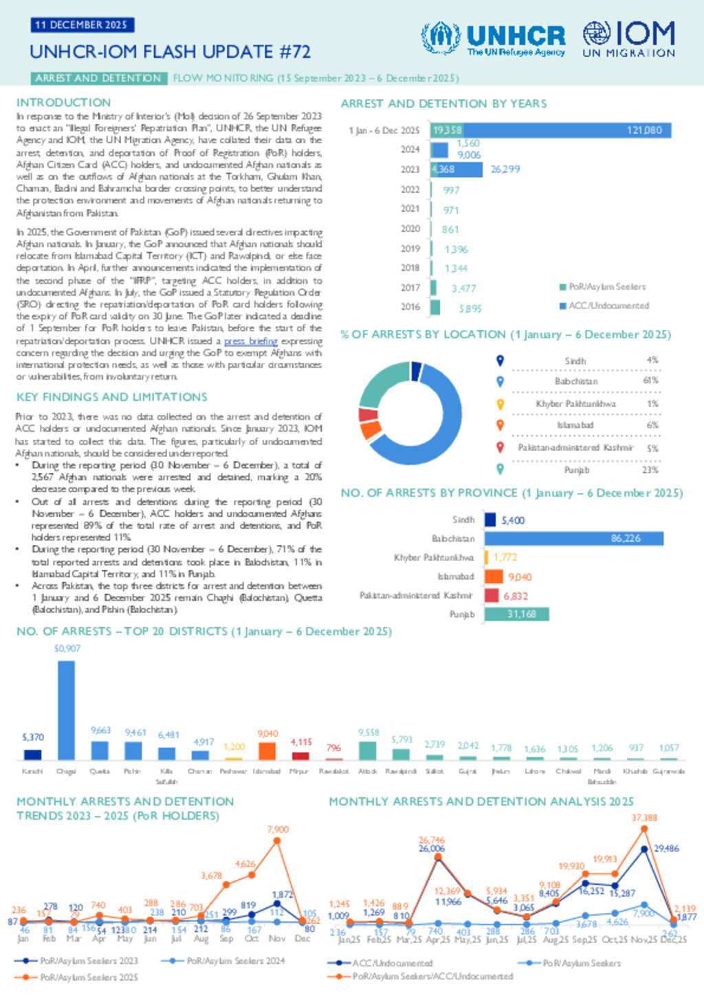 UNHCR-IOM Pakistan Flash update # 72 on Arrest and Detention/Flow Monitoring, 15 Sep 2023 to 6 December 2025