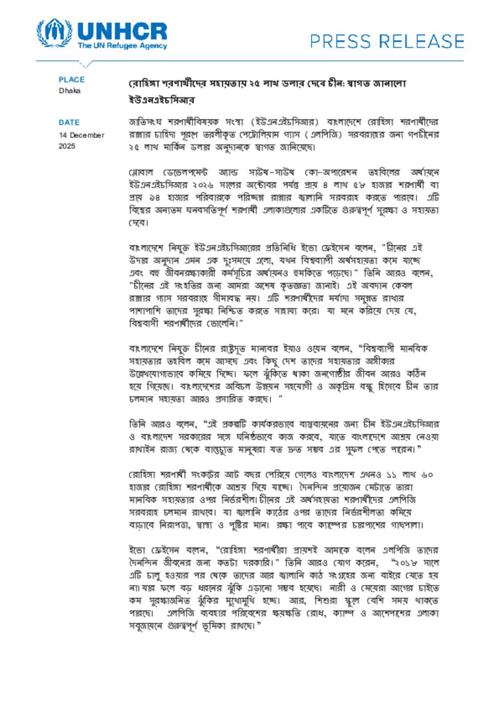 China’s USD 2.5 million contribution supports the delivery of LPG to around 458,000 Rohingya refugees in Bangladesh until October 2026. The initiative improves safety, health, and nutrition while reducing reliance on firewood. It also helps protect surrounding forests and eases protection risks, especially for women and girls.