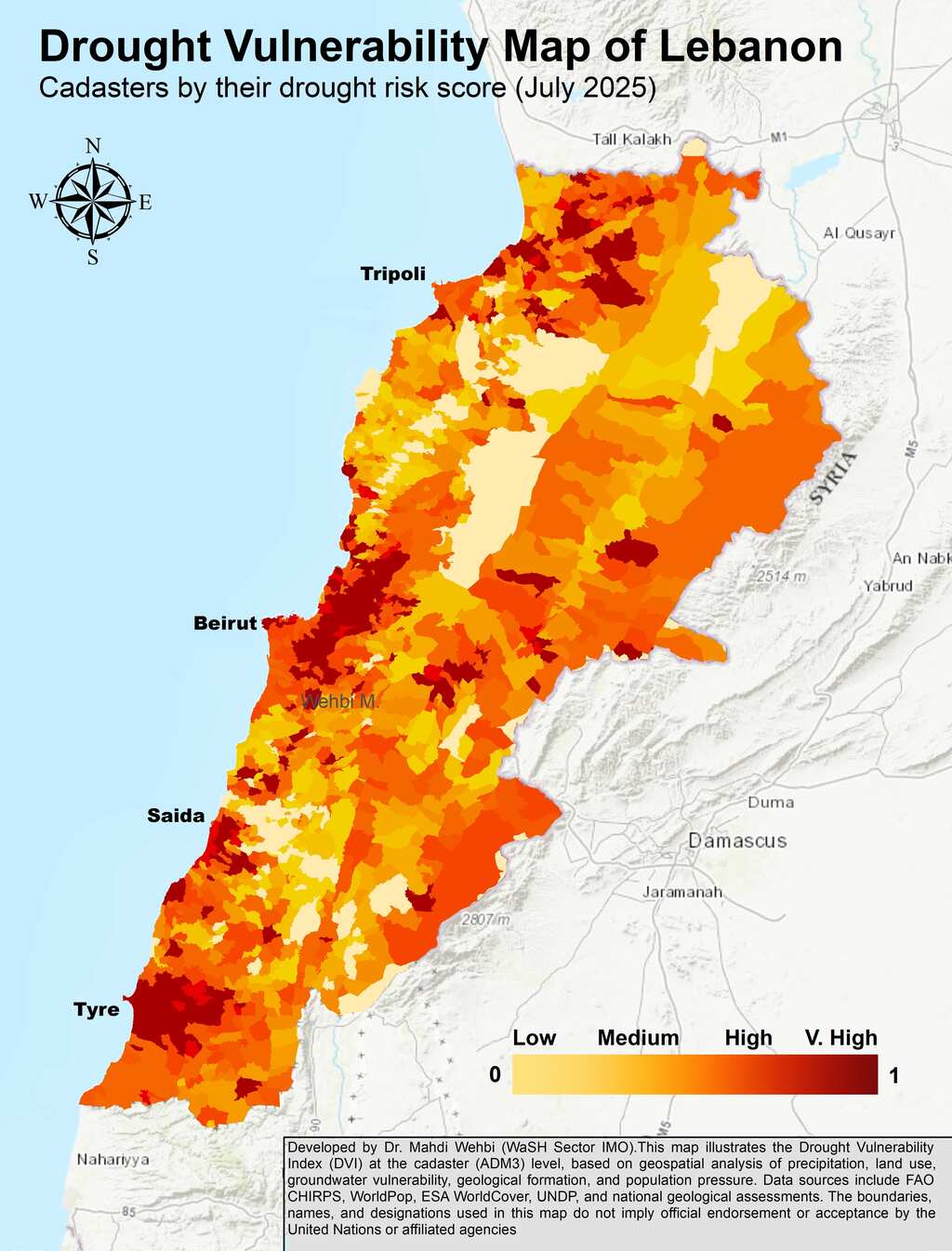 This drought vulnerability map for Lebanon is the outcome of a research-driven and consultative process that integrates geospatial analysis, scientific modeling, and stakeholder input. At its core is the Composite Drought Vulnerability Index (DVI), developed by Dr. Mahdi Wehbi (WaSH Sector IMO) to inform national planning, coordination, and advocacy amid increasing water stress. The DVI was constructed using a Spatial Multi-Criteria Analysis approach, supported by remote sensing, GIS, and globally recognized drought indices such as the SPI/SPEI. It integrates five key indicators, precipitation trends and drought anomalies, groundwater vulnerability (DRASTIC and salinity), land use/land cover, geological (hydrogeological) resilience, and population pressure- reflecting the dimensions of exposure, sensitivity, and adaptive capacity.