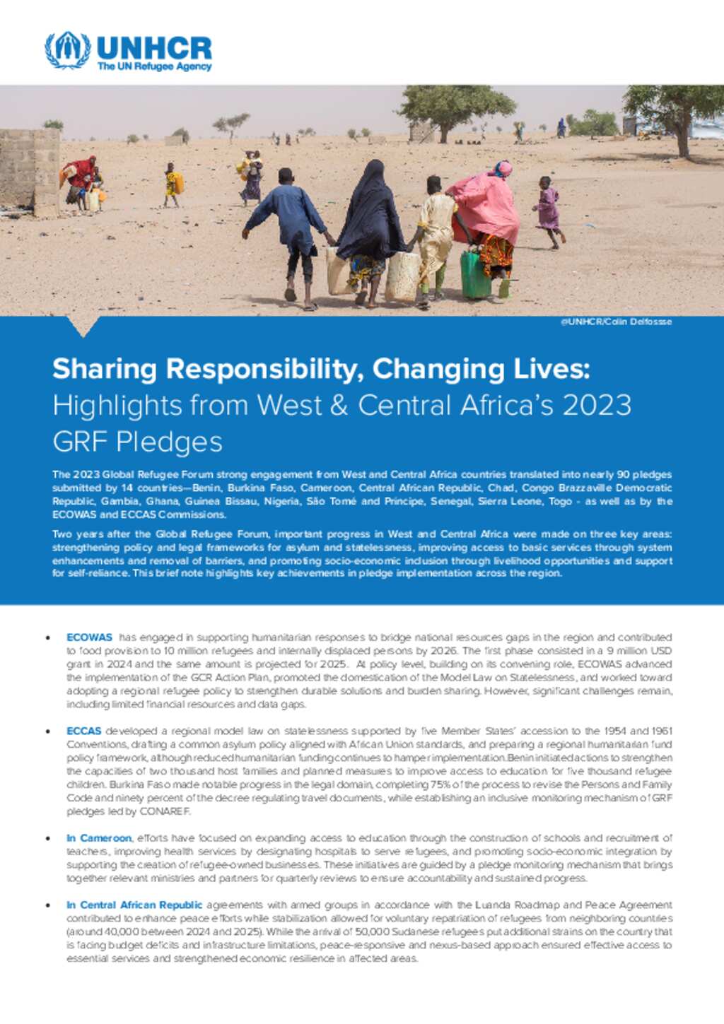 The 2023 Global Refugee Forum strong engagement from West and Central Africa countries translated into nearly 90 pledges submitted by 14 countries—Benin, Burkina Faso, Cameroon, Central African Republic, Chad, Congo Brazzaville Democratic Republic, Gambia, Ghana, Guinea Bissau, Nigeria, São Tomé and Príncipe, Senegal, Sierra Leone, Togo - as well as by the ECOWAS and ECCAS Commissions. Two years after the Global Refugee Forum, important progress in West and Central Africa were made on three key areas: strengthening policy and legal frameworks for asylum and statelessness, improving access to basic services through system enhancements and removal of barriers, and promoting socio-economic inclusion through livelihood opportunities and support for self-reliance. This brief note highlights key achievements in pledge implementation across the region.