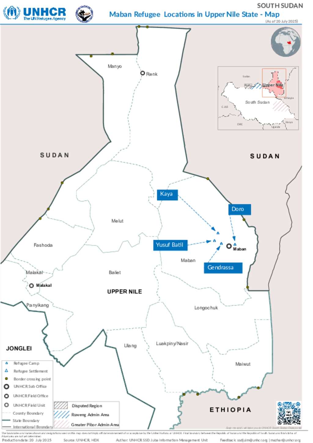 The Maban Refugee Locations Map is a humanitarian planning and monitoring tool developed by UNHCR to visualize the distribution of refugees in Upper Nile State, South Sudan, specifically within Maban County. This area hosts one of the largest concentrations of refugees in the country, primarily from Blue Nile State, Sudan, displaced by conflict and insecurity.