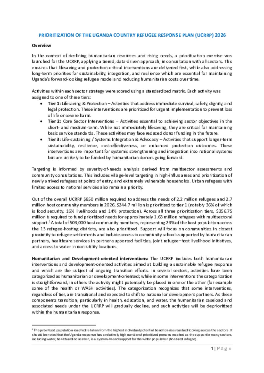 Uganda Country Refugee Response Plan (UCRRP) 2026 Prioritization