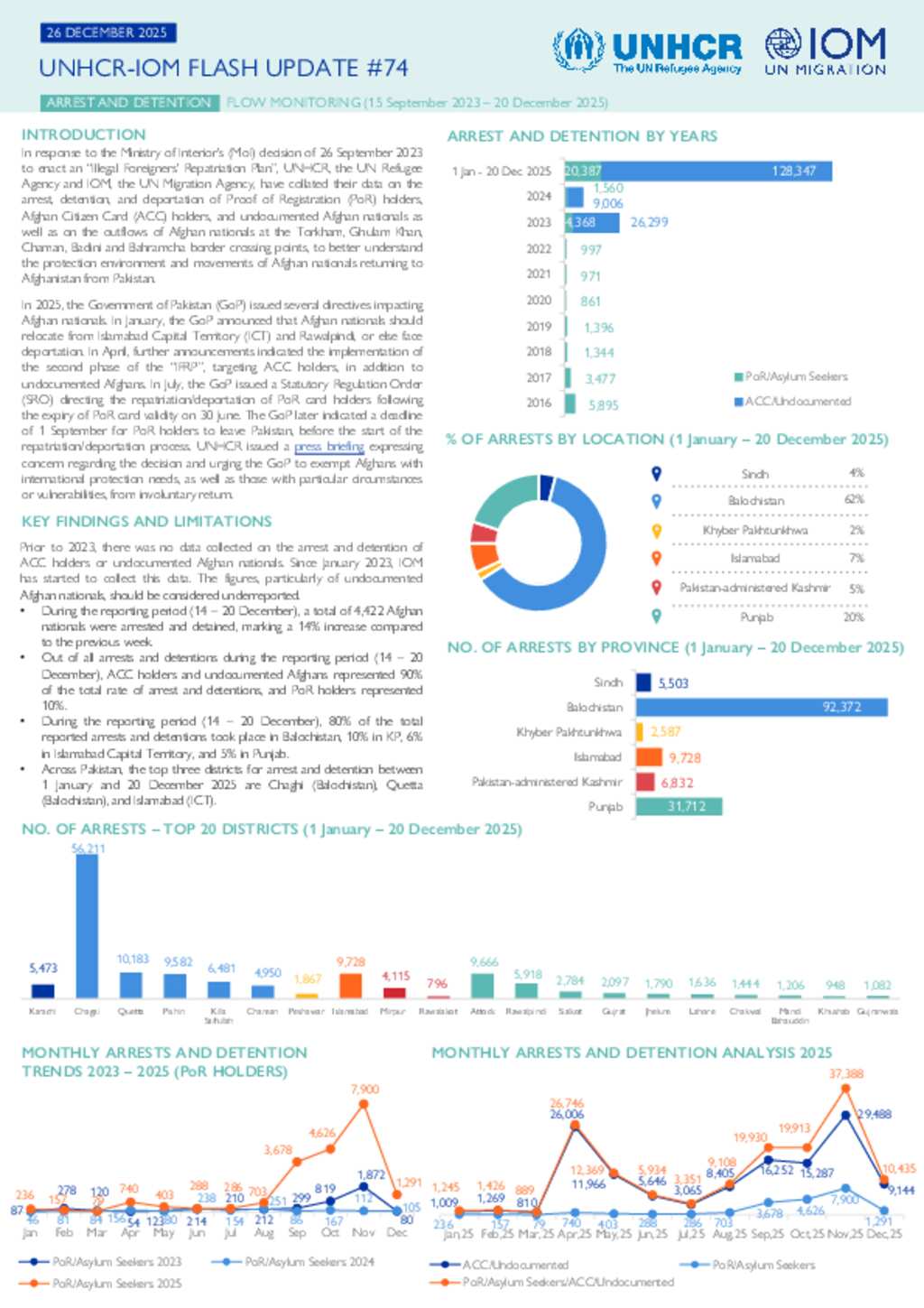 UNHCR-IOM Pakistan Flash update # 74 on Arrest and Detention/Flow Monitoring, 15 Sep 2023 to 20 December 2025