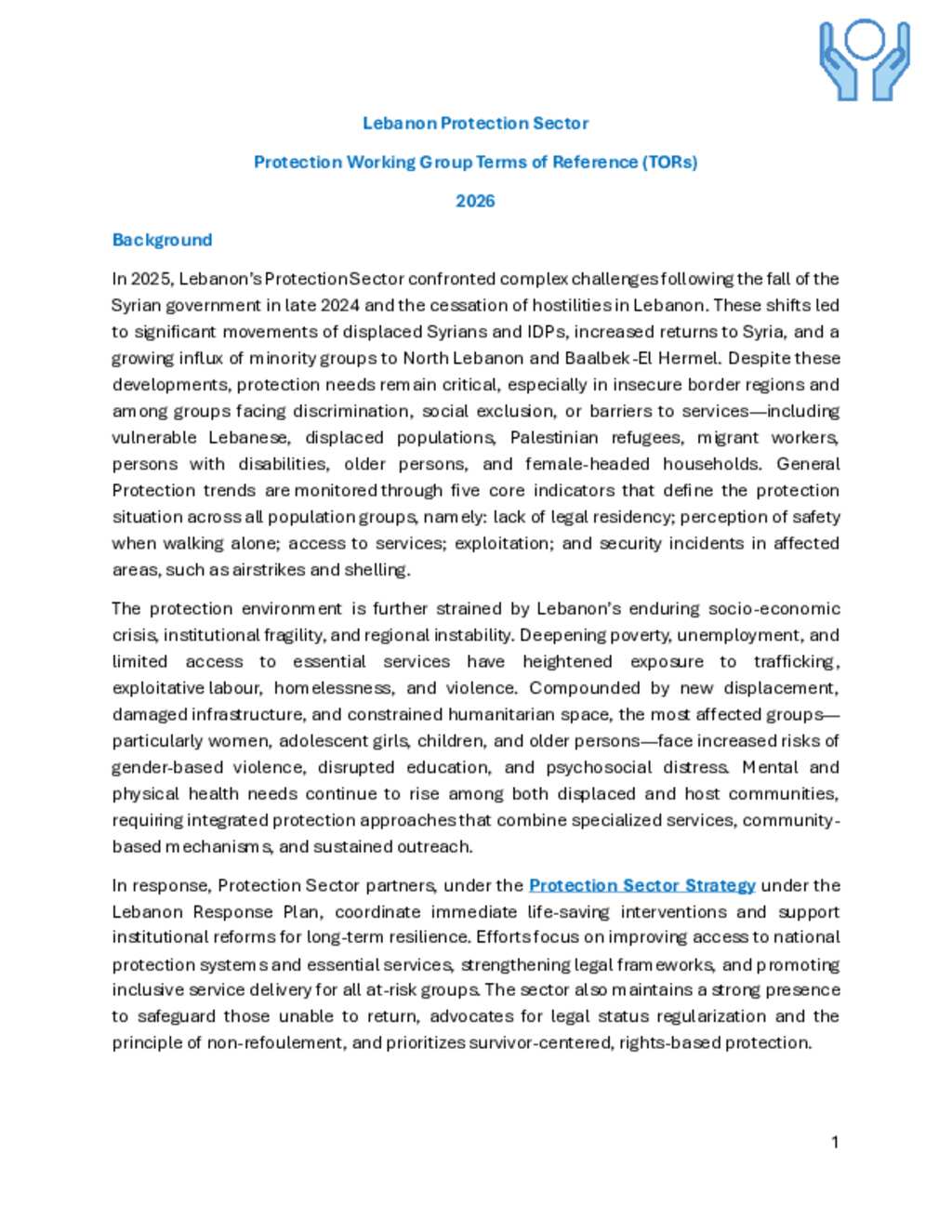 Lebanon: Protection Working Group Terms of Reference (TORs) - 2026