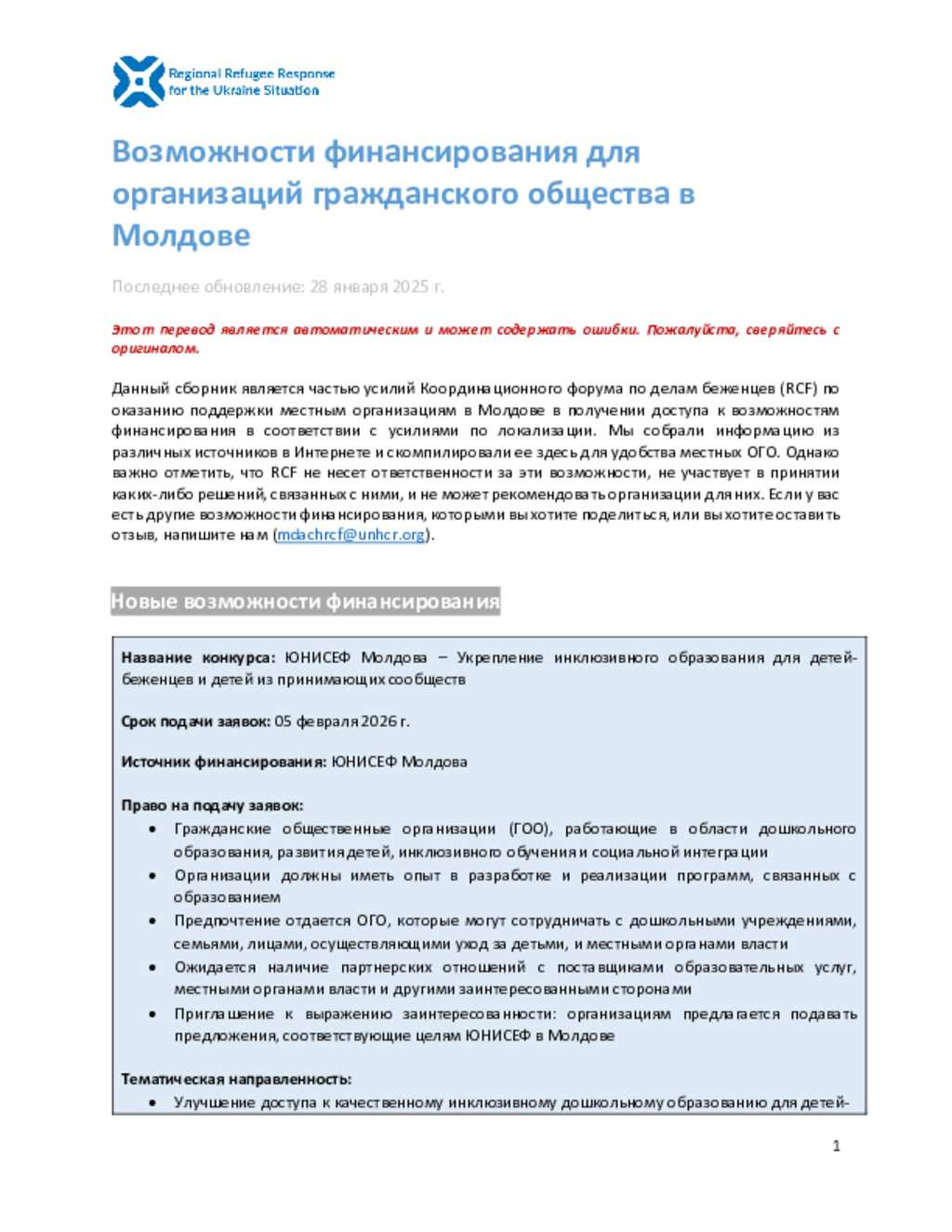 Ukraine Situation - Moldova: Funding Opportunities for Local CSOs in Moldova (February 2026) (RU)