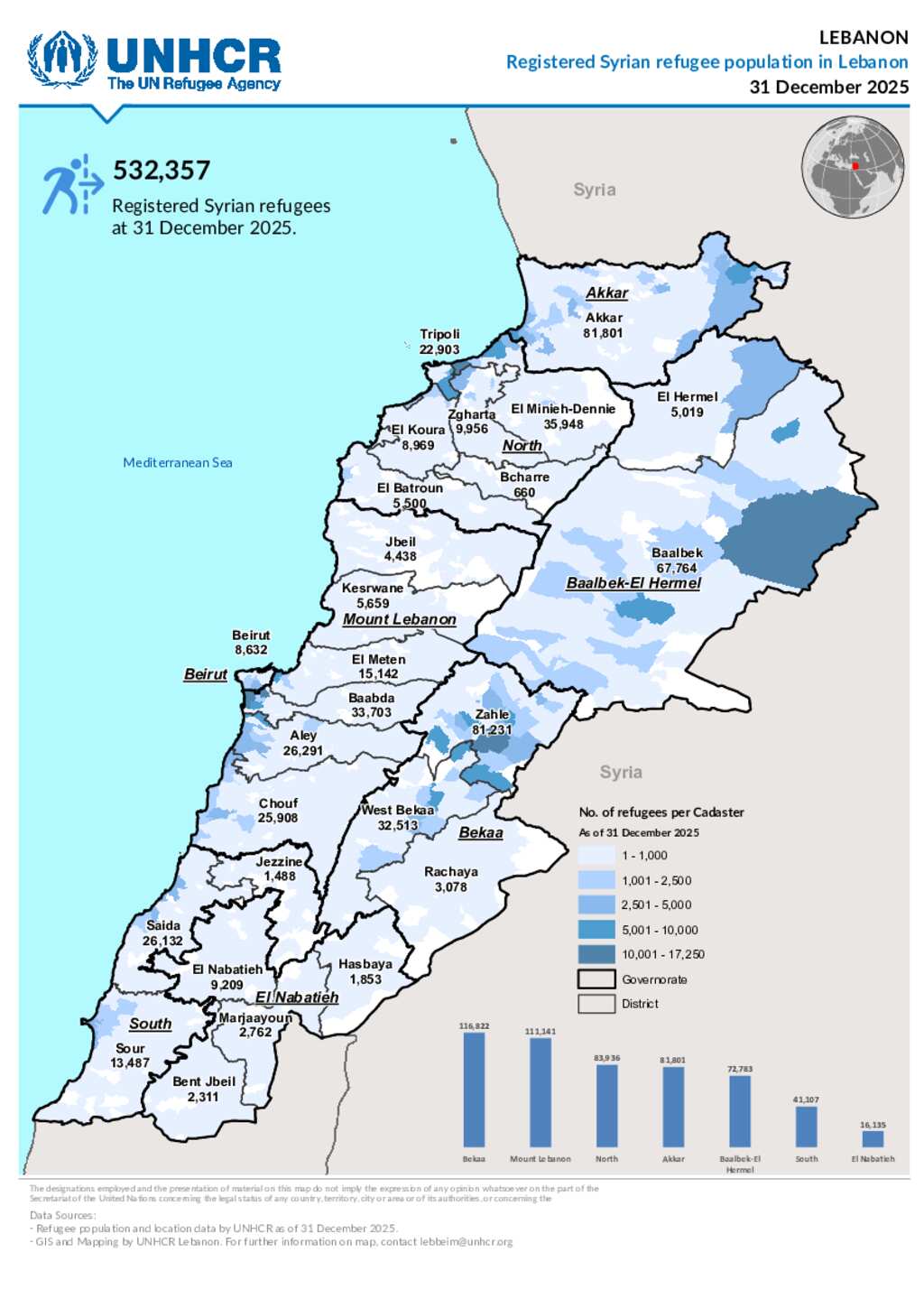 UNHCR - Registration - Lebanon - Map of Registered Syrian Refugees by District in Lebanon - 31/12/2025