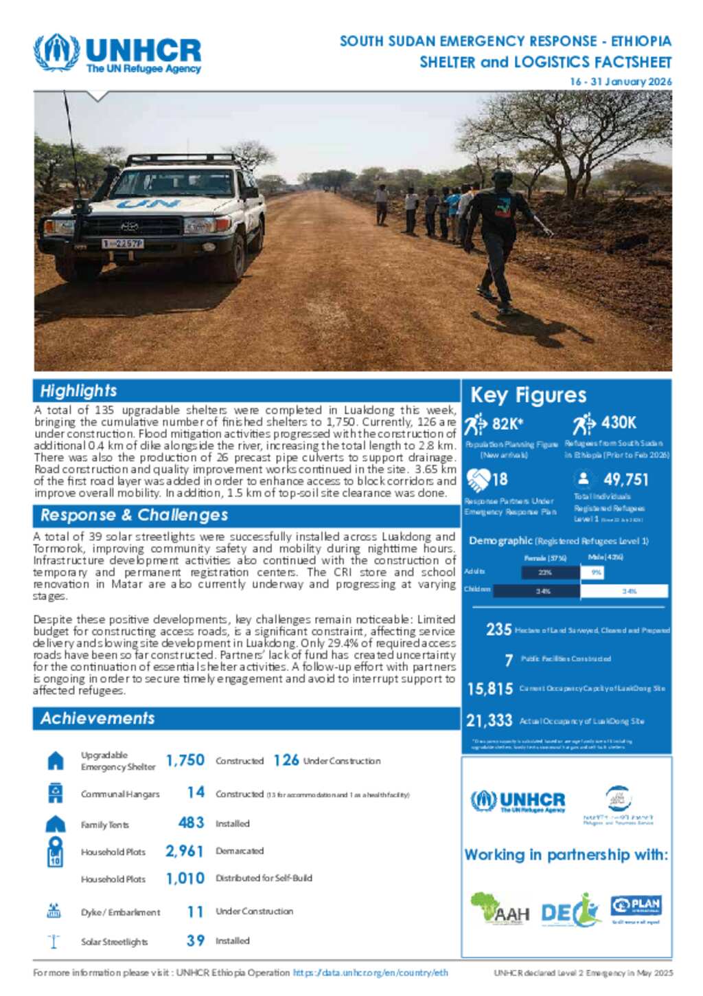 UNHCR Ethiopia | South Sudan Response Thematic Factsheet - Shelter | January 2026