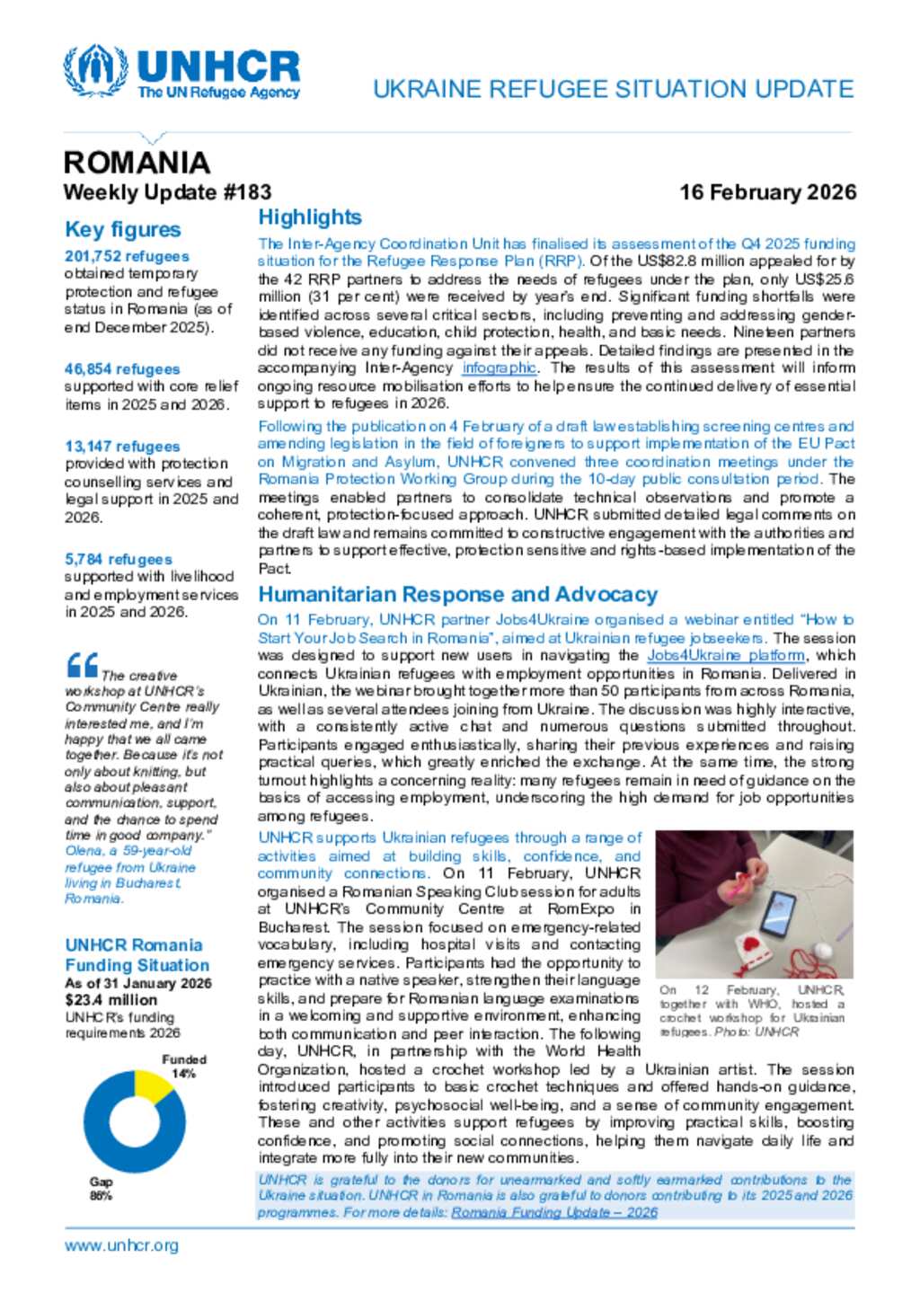UNHCR Romania Ukraine Refugee Situation Update - 16 February 2026