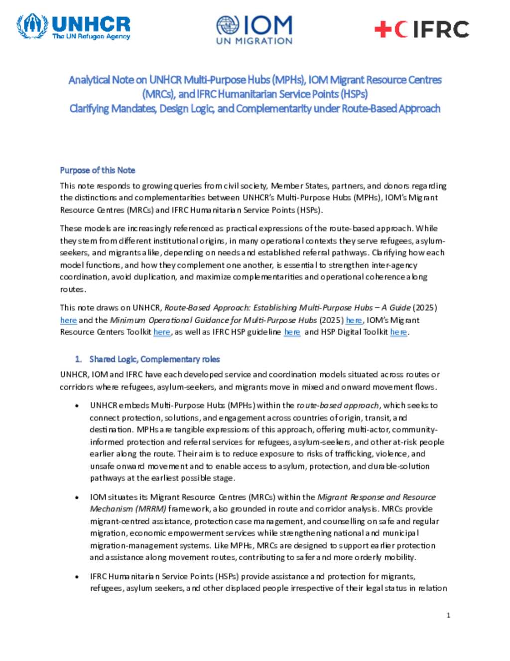 This note responds to growing queries from civil society, Member States, partners, and donors regarding the distinctions and complementarities between UNHCR’s Multi-Purpose Hubs (MPHs), IOM’s Migrant Resource Centres (MRCs) and IFRC Humanitarian Service Points (HSPs). These models are increasingly referenced as practical expressions of the route-based approach. While they stem from different institutional origins, in many operational contexts they serve refugees, asylum-seekers, and migrants alike, depending on needs and established referral pathways. Clarifying how each model functions, and how they complement one another, is essential to strengthen inter-agency coordination, avoid duplication, and maximize complementarities and operational coherence along routes.