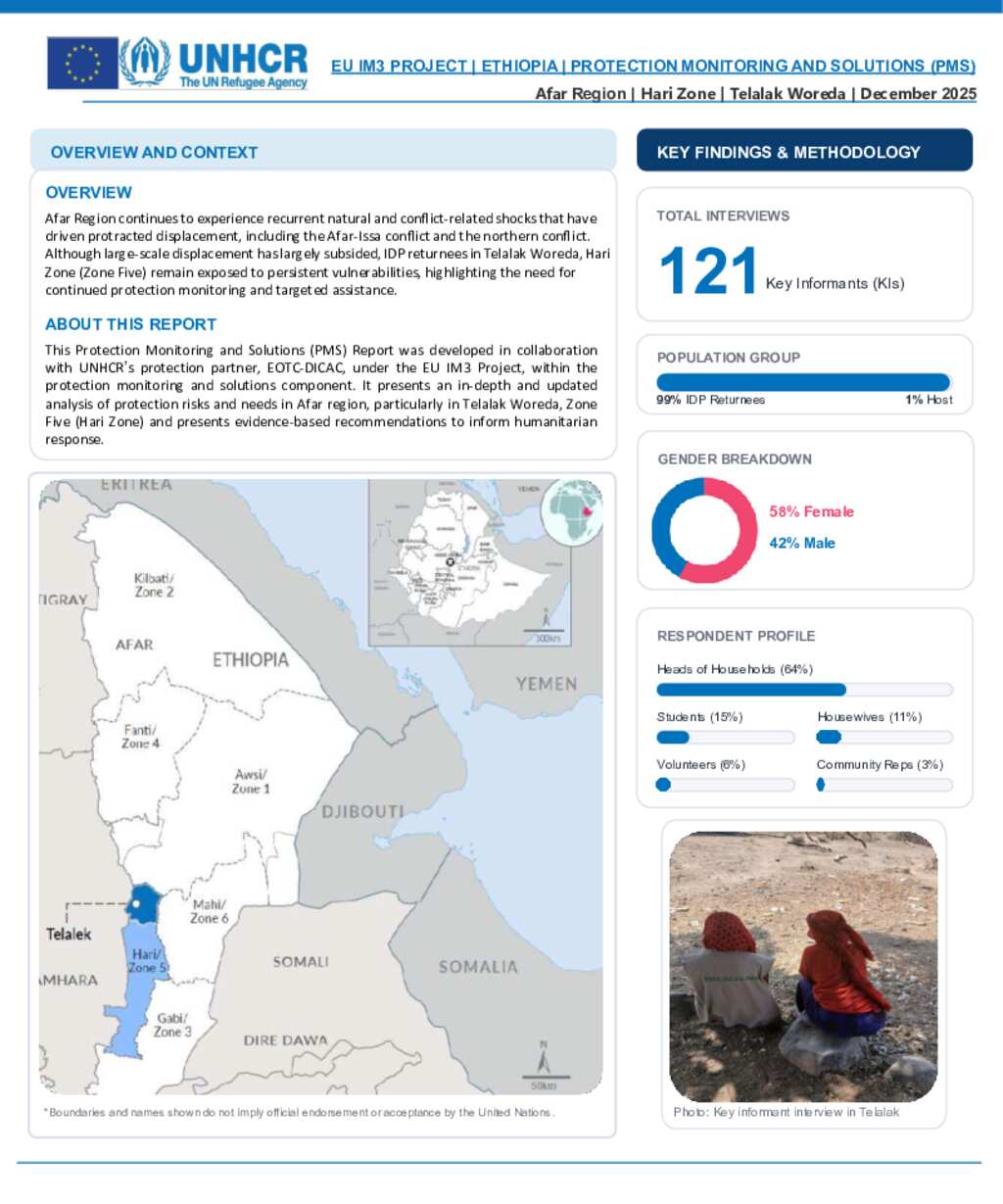 This Protection Monitoring and Solutions (PMS) Report was developed in collaboration with UNHCR’s protection partner, EOTC-DICAC, under the EU IM3 Project, within the protection monitoring and solutions component. It presents an in-depth and updated analysis of protection risks and needs in Afar region, particularly in Telalak Woreda, Zone Five (Hari Zone) and presents evidence-based recommendations to inform humanitarian response.