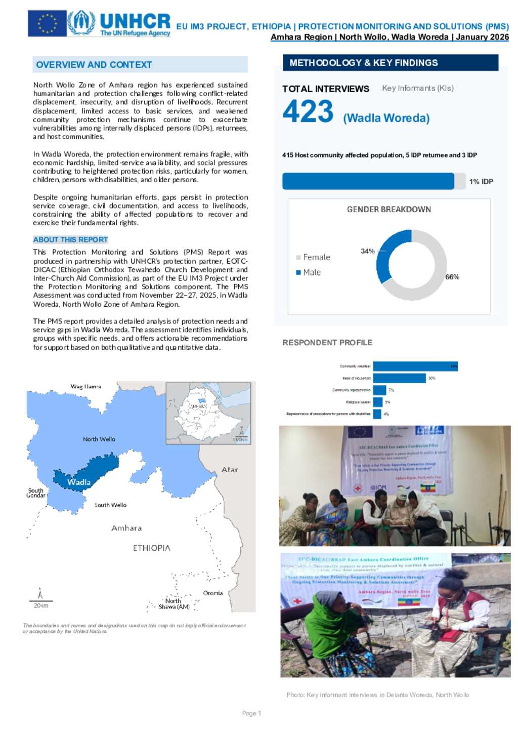 This Protection Monitoring and Solutions (PMS) Report was produced in partnership with UNHCR’s protection partner, EOTC-DICAC (Ethiopian Orthodox Tewahedo Church Development and Inter-Church Aid Commission), as part of the EU IM3 Project under the Protection Monitoring and Solutions component. The PMS Assessment was conducted from November 22–27, 2025, in Wadla Woreda, North Wollo Zone of Amhara Region.