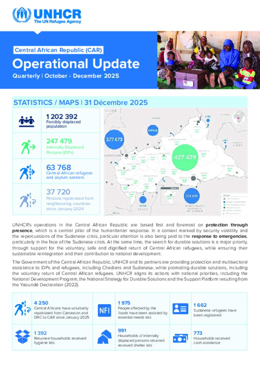 UNHCR's operations in the Central African Republic are based first and foremost on protection through presence, which is a central pillar of the humanitarian response. In a context marked by security volatility and the repercussions of the Sudanese crisis, particular attention is also being paid to the response to emergencies, particularly in the face of the Sudanese crisis. At the same time, the search for durable solutions is a major priority, through support for the voluntary, safe and dignified return of Central African refugees, while ensuring their sustainable reintegration and their contribution to national development. The Government of the Central African Republic, UNHCR and its partners are providing protection and multisectoral assistance to IDPs and refugees, including Chadians and Sudanese, while promoting durable solutions, including the voluntary return of Central African refugees. UNHCR aligns its actions with national priorities, including the National Development Program, the National Strate
