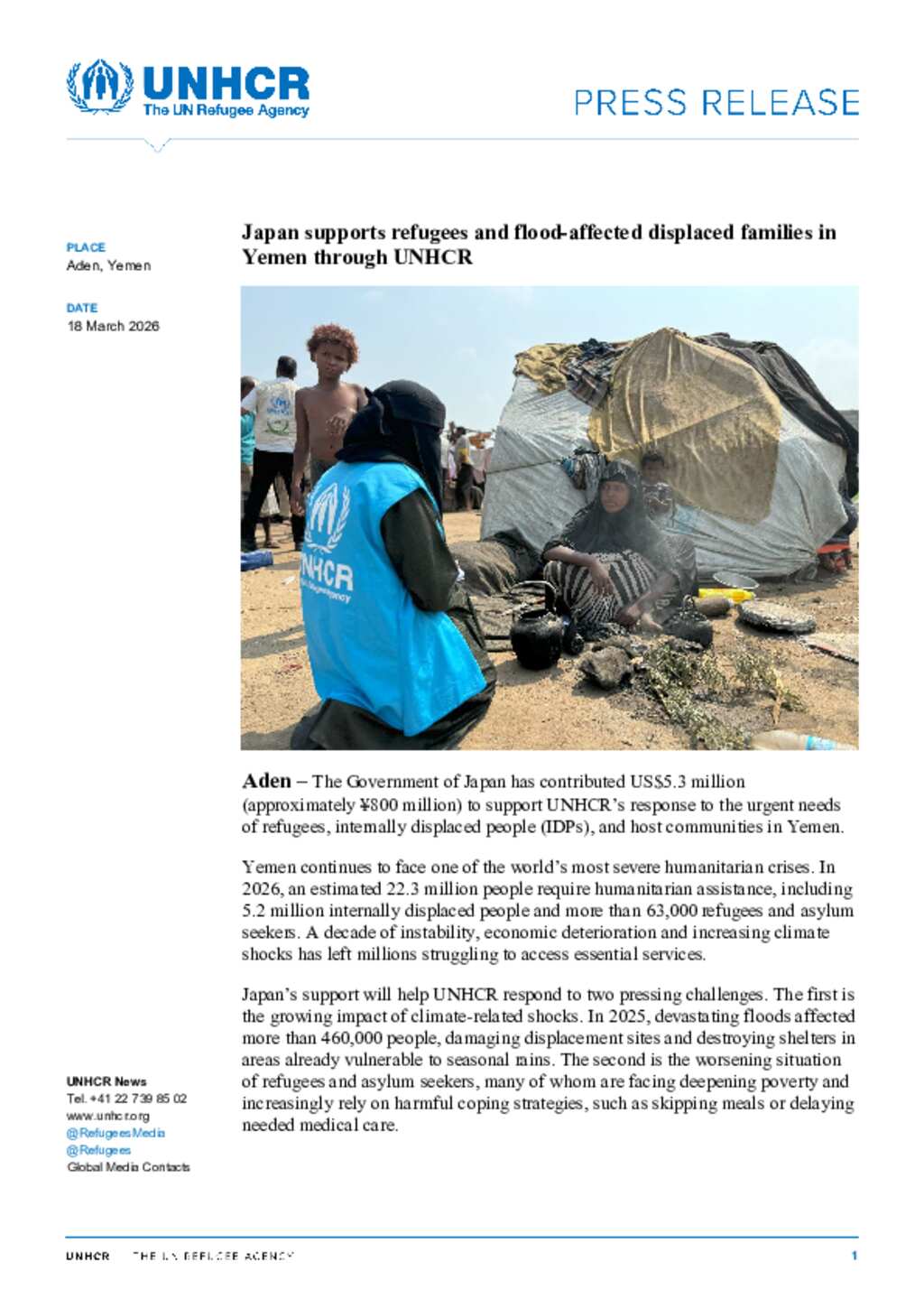 UNHCR Yemen Press Release_Japan supports refugees and flood-affected displaced families in Yemen through UNHCR