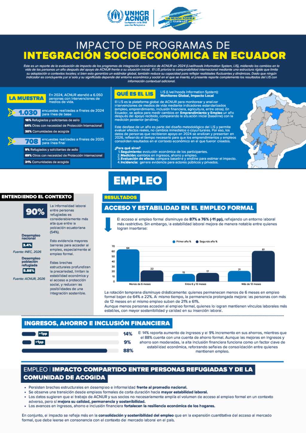 Reporte de la evaluación de impacto de los programas de integración económica de ACNUR en 2024 (Livelihoods Information System, LIS), midiendo los cambios en la vida de las personas un año después del apoyo de ACNUR frente a su situación inicial.