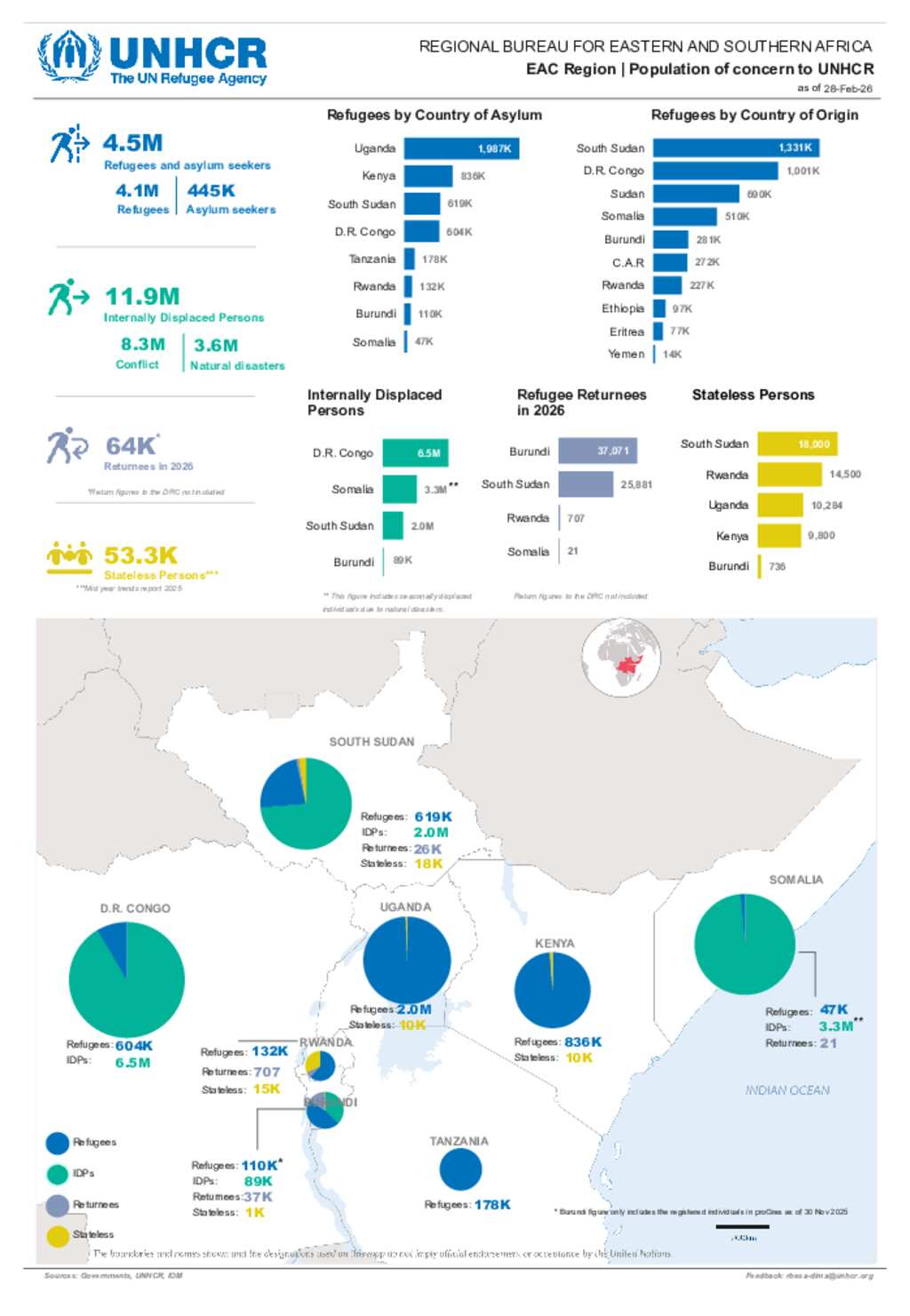 Regional Dashboard RBESA: Refugees, returnees and internally displaced persons in the EAC region - 28 February 2026