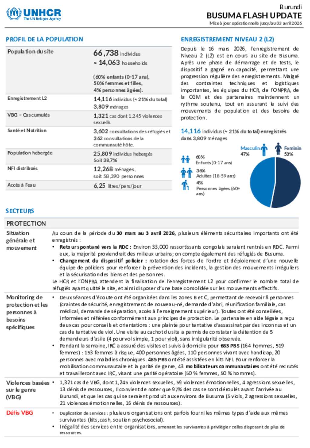 Le site de Busuma accueille des réfugiés congolais depuis décembre 2025. Les principales activités incluent l’enregistrement, la sensibilisation communautaire et la coordination avec les partenaires. Toutefois, le site fait face à plusieurs défis, notamment la capacité d’accueil limitée, les contraintes logistiques, l’insuffisance d’équipements et la gestion du flux croissant des réfugiés.