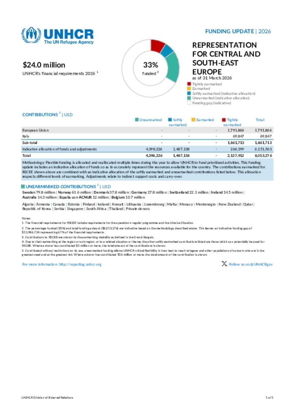 Representation for Central and South-East Europe (RCSEE), funding update as of 31 March 2026. RCSEE is based in Budapest.