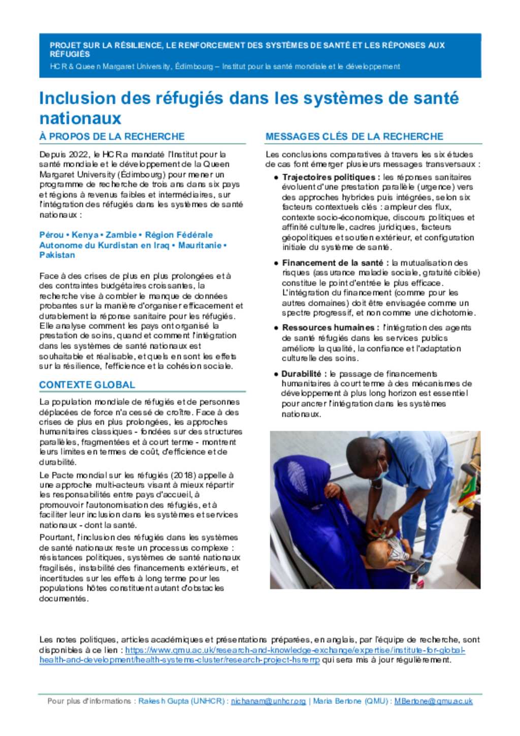 Depuis 2022, le HCR a mandaté l’Institut pour la santé mondiale et le développement de la Queen Margaret University (Édimbourg) pour mener un programme de recherche de trois ans dans six pays et régions à revenus faibles et intermédiaires, sur l'intégration des réfugiés dans les systèmes de santé nationaux.