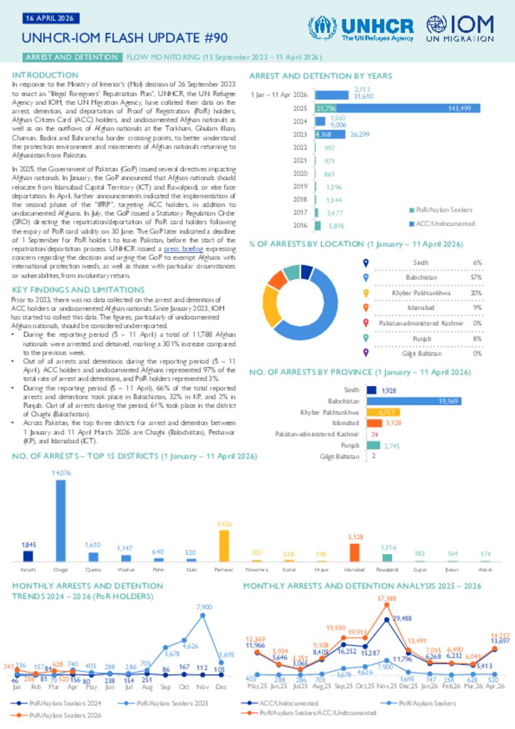 UNHCR-IOM Pakistan Flash update # 90 on Arrest and Detention/Flow Monitoring, 15 Sep 2023 to 11 April 2026
