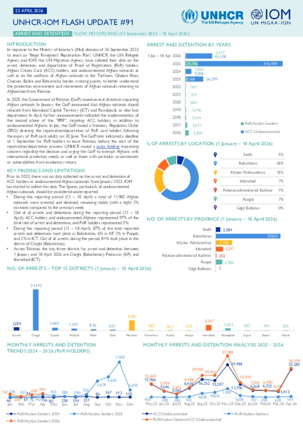 UNHCR-IOM Pakistan Flash update # 91 on Arrest and Detention/Flow Monitoring, 15 Sep 2023 to 18 April 2026