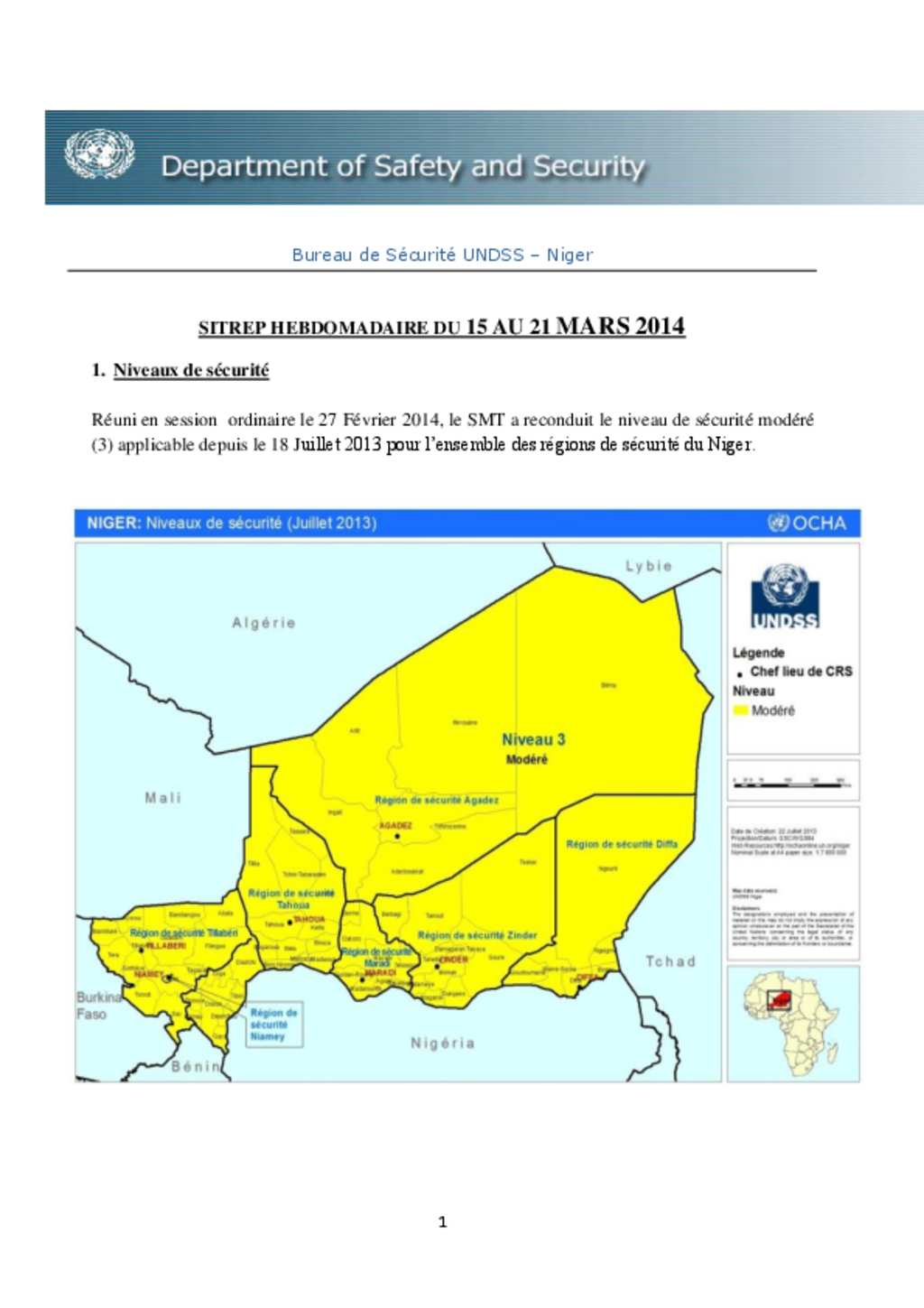 Bureau de Sécurité UNDSS – Niger: SITREP DU 15 AU 21 MARS 2014